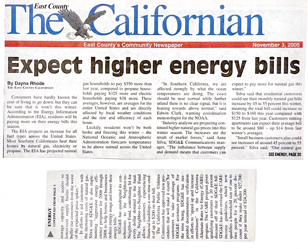- During my journalism internship I wrote hard news articles for a weekly community newspaper with a 32,500-copy circulation serving San Diego’s East County. Continued freelancing after internship ended.
